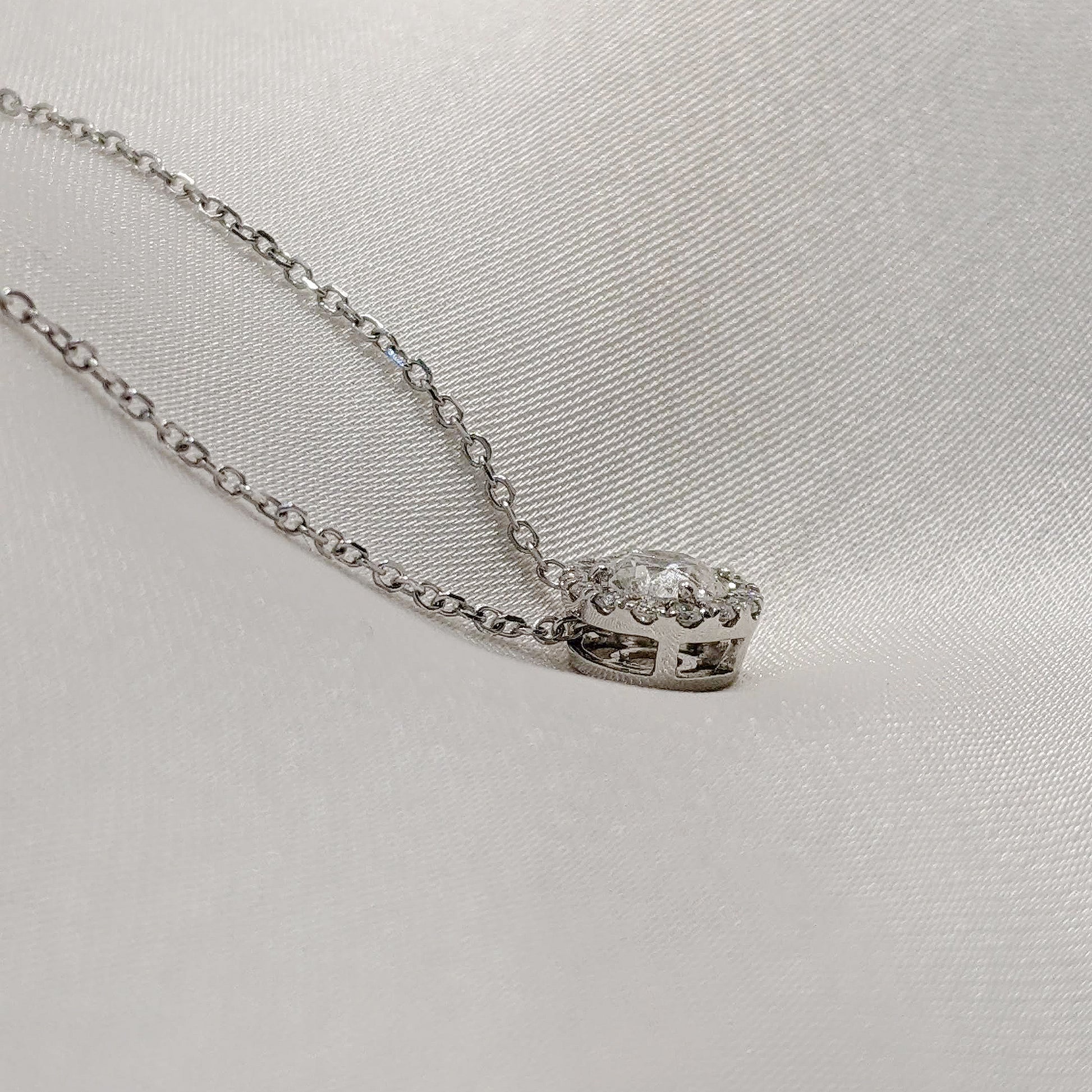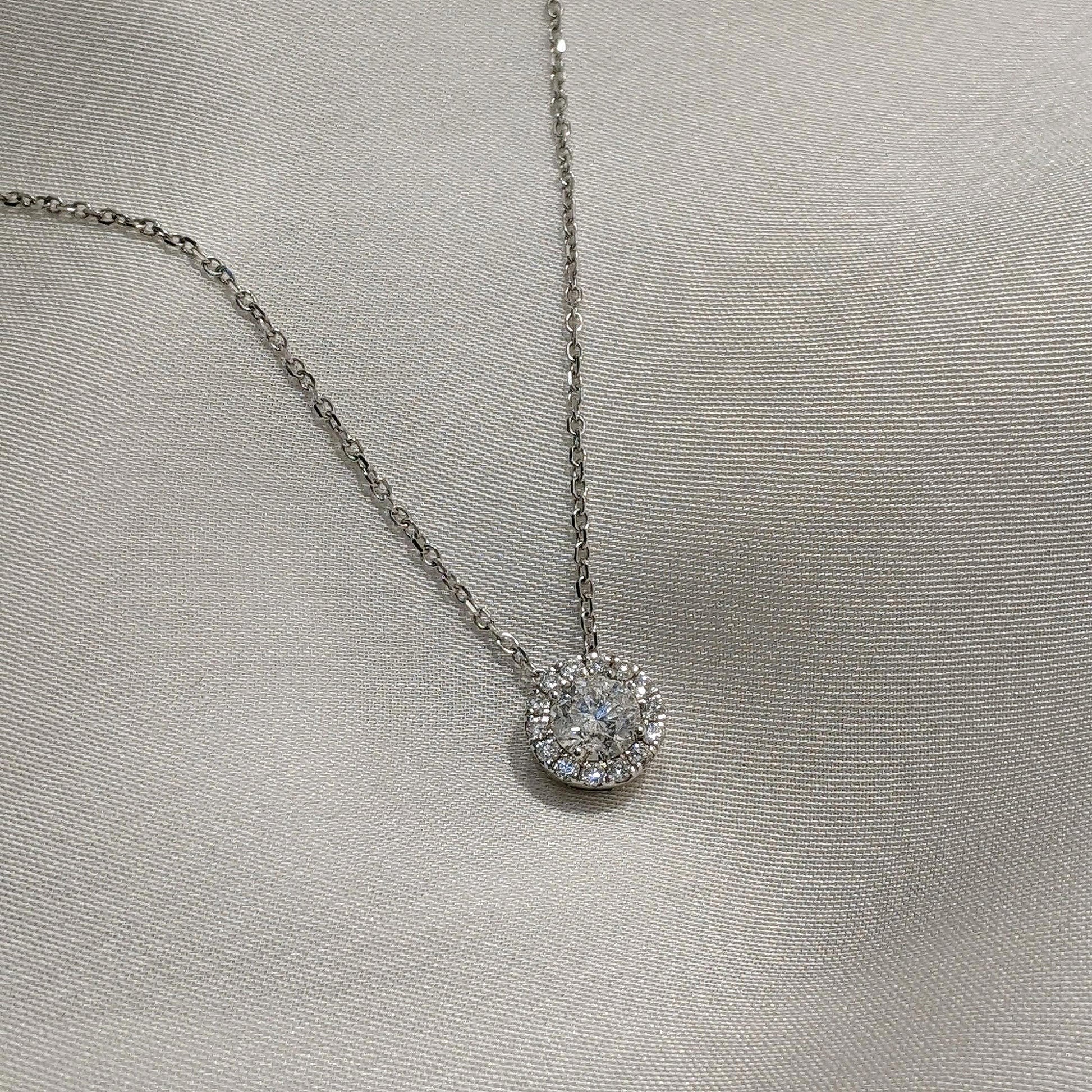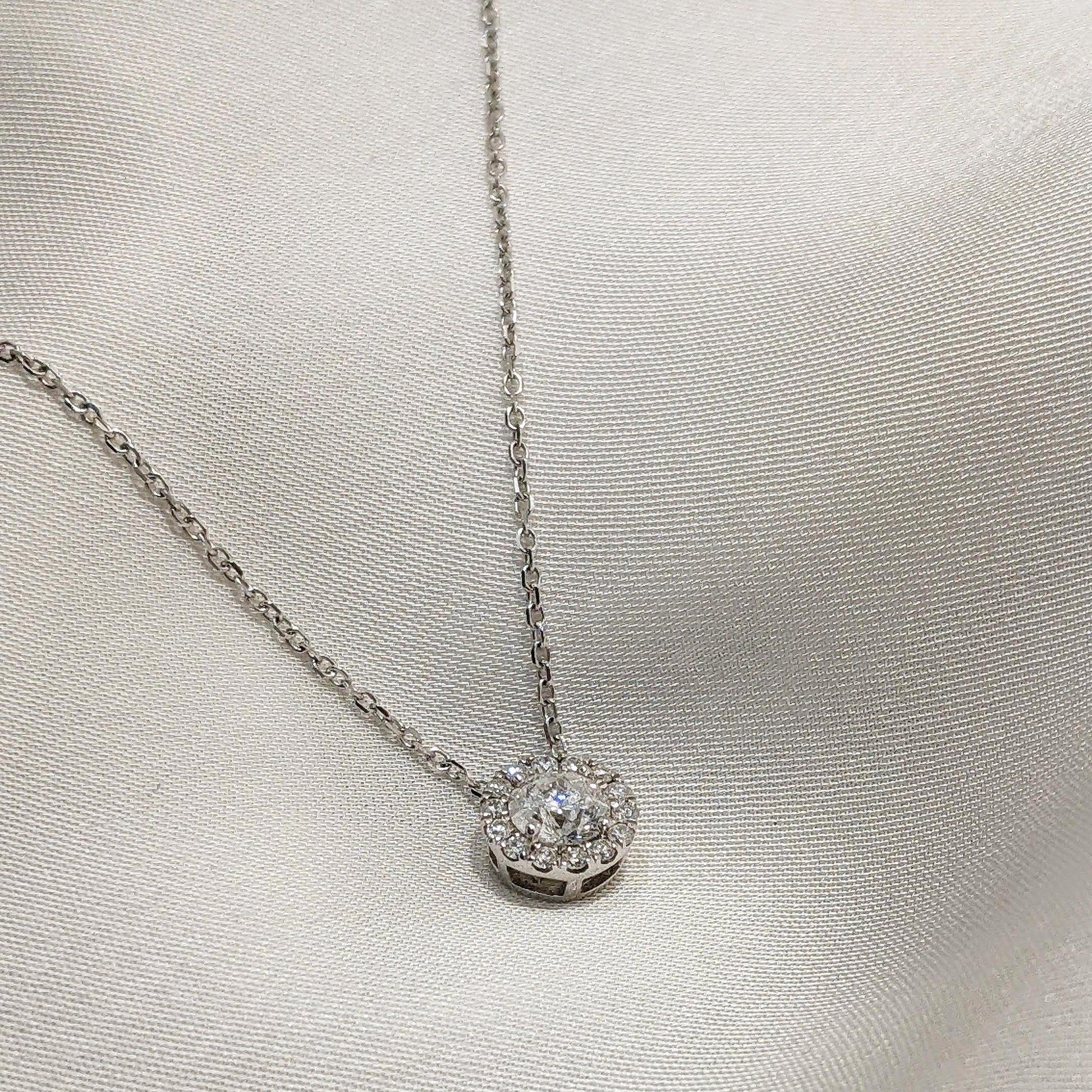 Tradition embraces modernity. A Round Brilliant-Cut centre Diamond, surrounded by a halo of Round Brilliant-Cut Diamonds. Additional glitz, without the overkill. The total Diamond weight of the pendant is 0.44ct, and it is set into 18ct White Gold. The Belcher Chain runs through the top of the setting, and is made in 18ct White Gold.