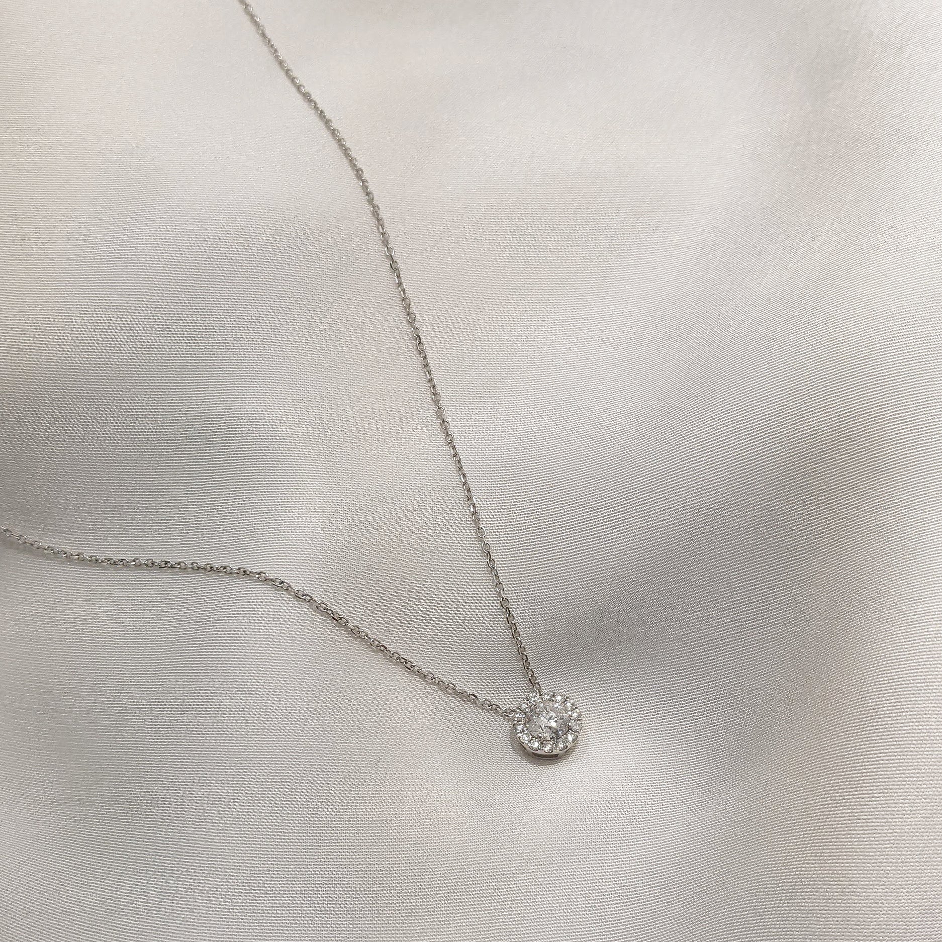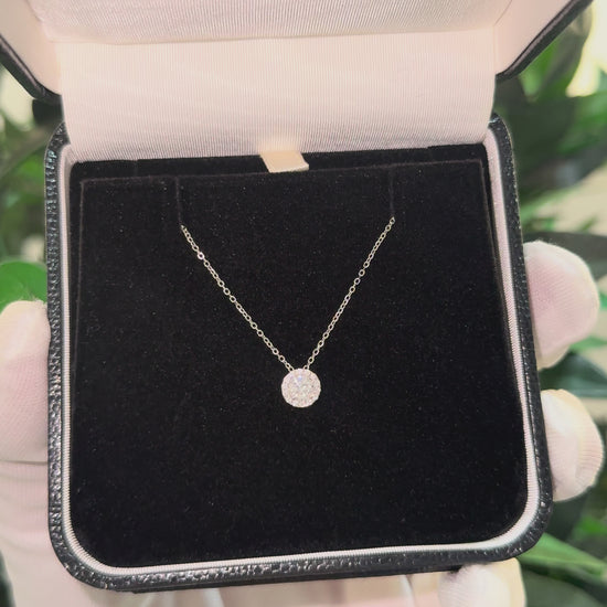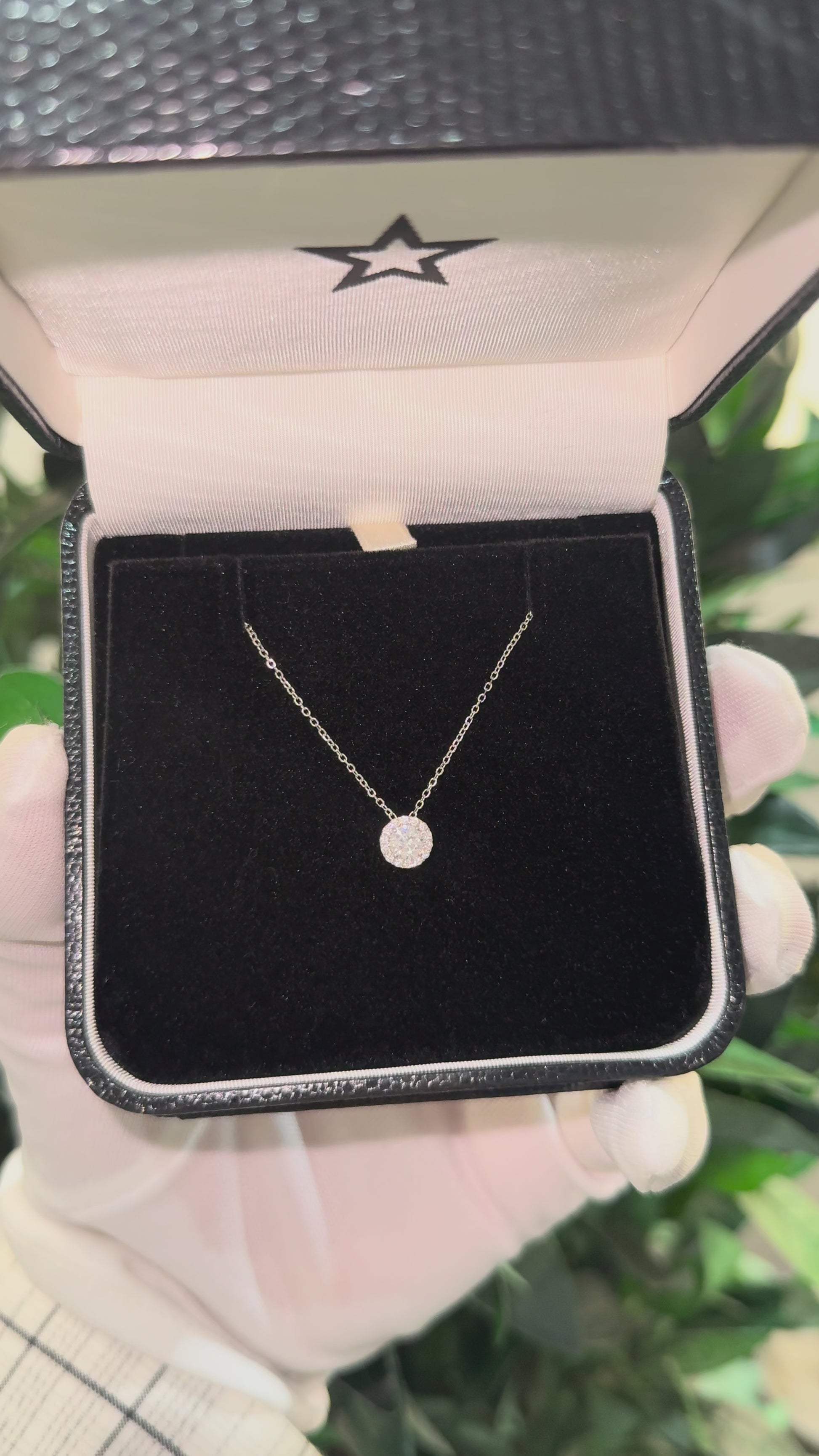 Tradition embraces modernity. A Round Brilliant-Cut centre Diamond, surrounded by a halo of Round Brilliant-Cut Diamonds. Additional glitz, without the overkill. The total Diamond weight of the pendant is 0.44ct, and it is set into 18ct White Gold. The Belcher Chain runs through the top of the setting, and is made in 18ct White Gold.