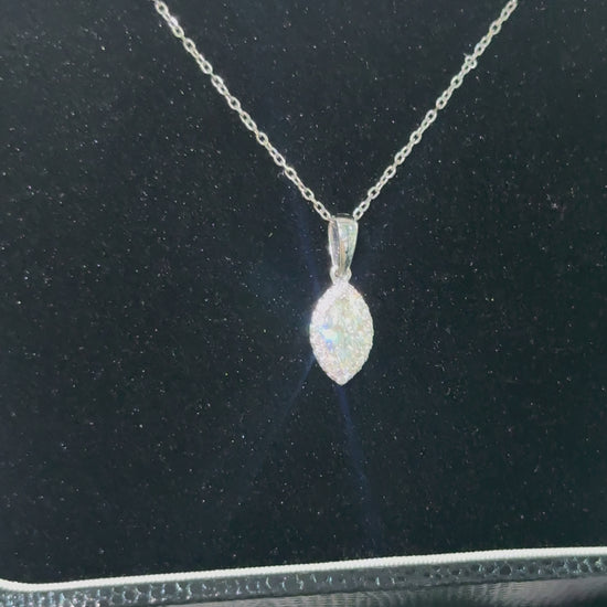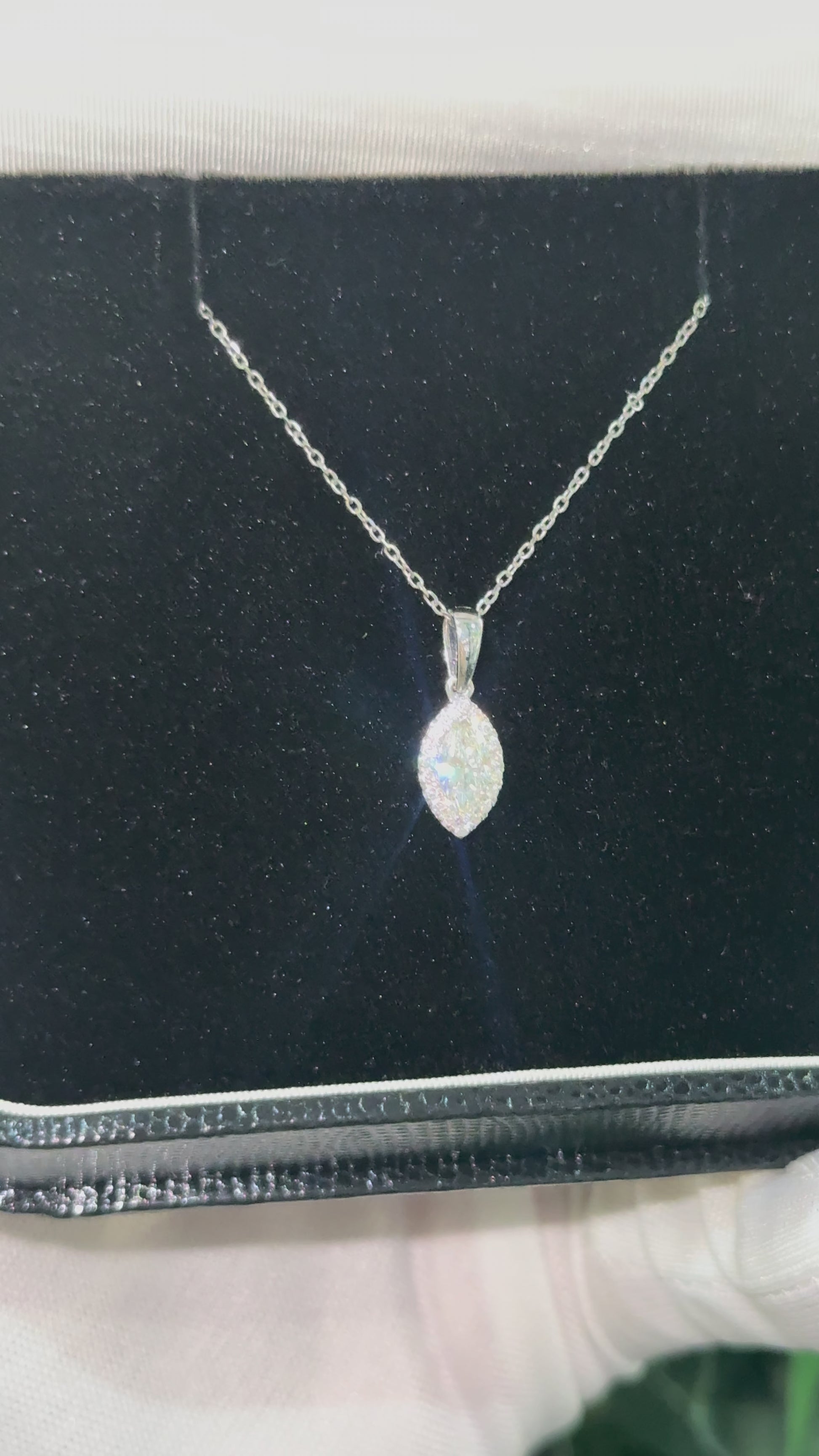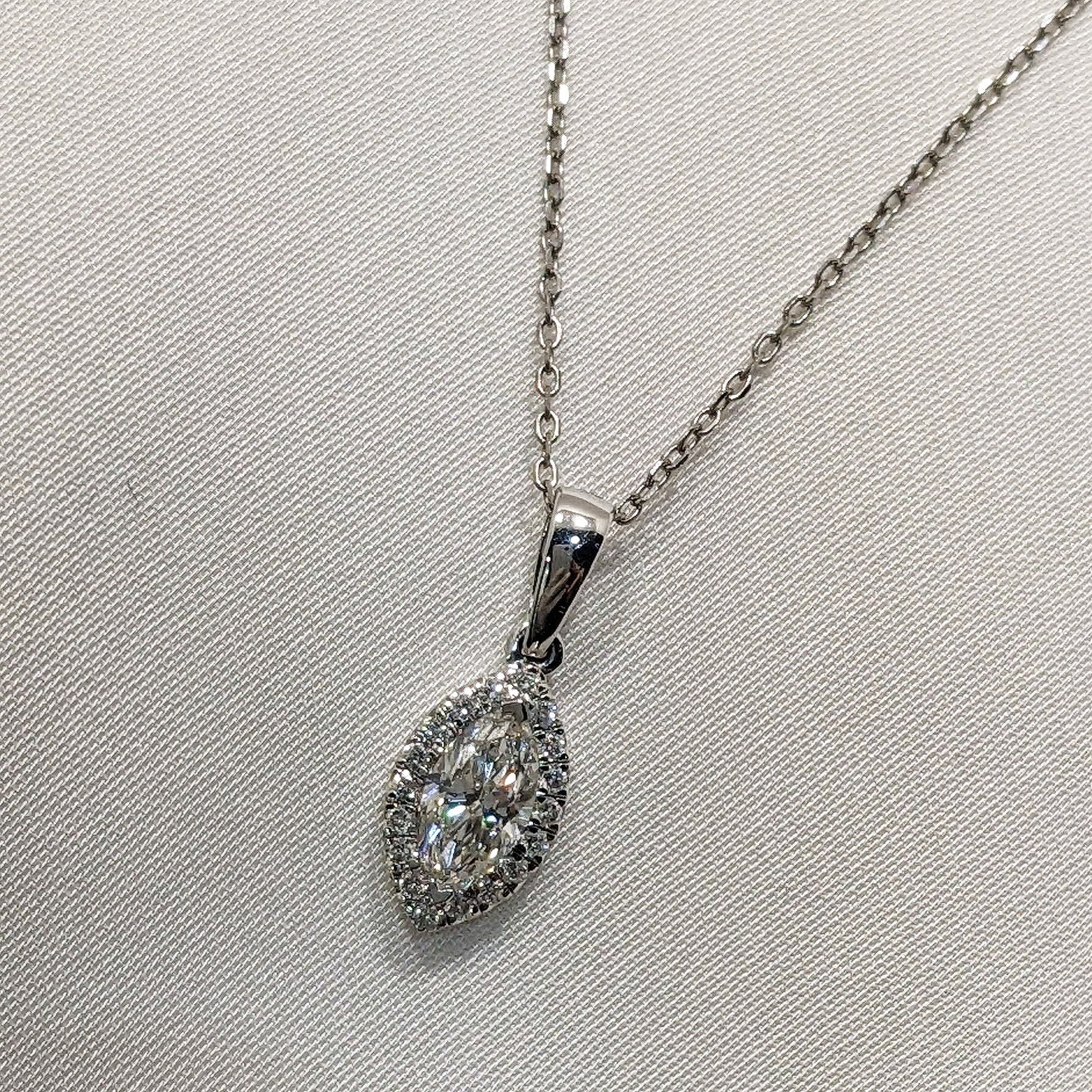 Our Marquise Halo Pendant is a statement piece. Featuring a 0.57ct Diamond total content, the centre Marquise-Cut natural Diamond is surrounded by a Halo of Round Brilliant-Cut Diamonds. This design is crafted in 18ct White Gold, with an interchangeable Diamond-Cut Chain running through a bail.