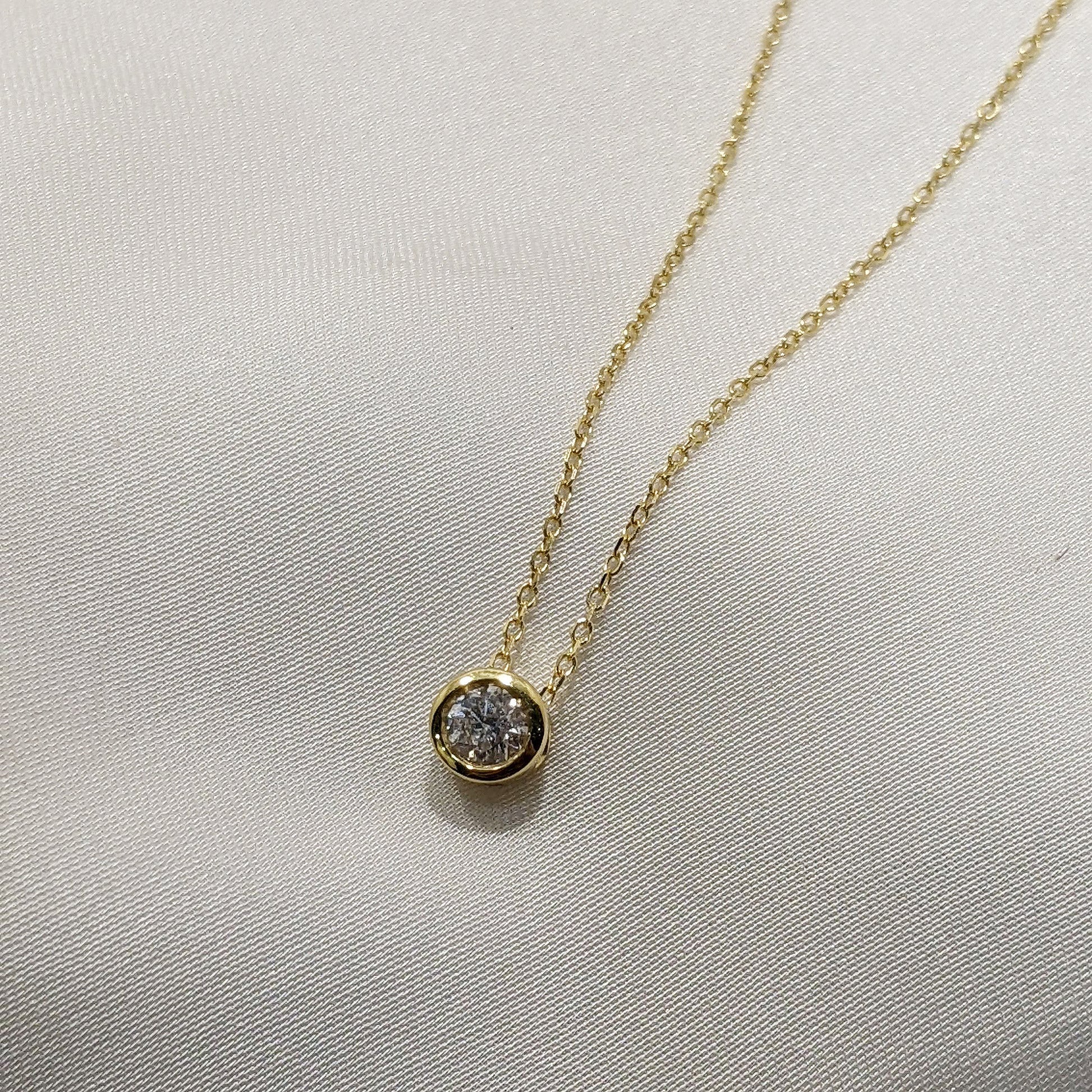 A stunning 0.25ct natural white Round Brilliant-Cut Diamond stars in this 18ct Yellow Gold pendant. The innovative rubover setting maximises the Diamond by allowing light to flood in from all angles, ensuring your diamond catches every gleam. The setting attaches to a classic 16inch 18ct Yellow Gold Belcher Chain.