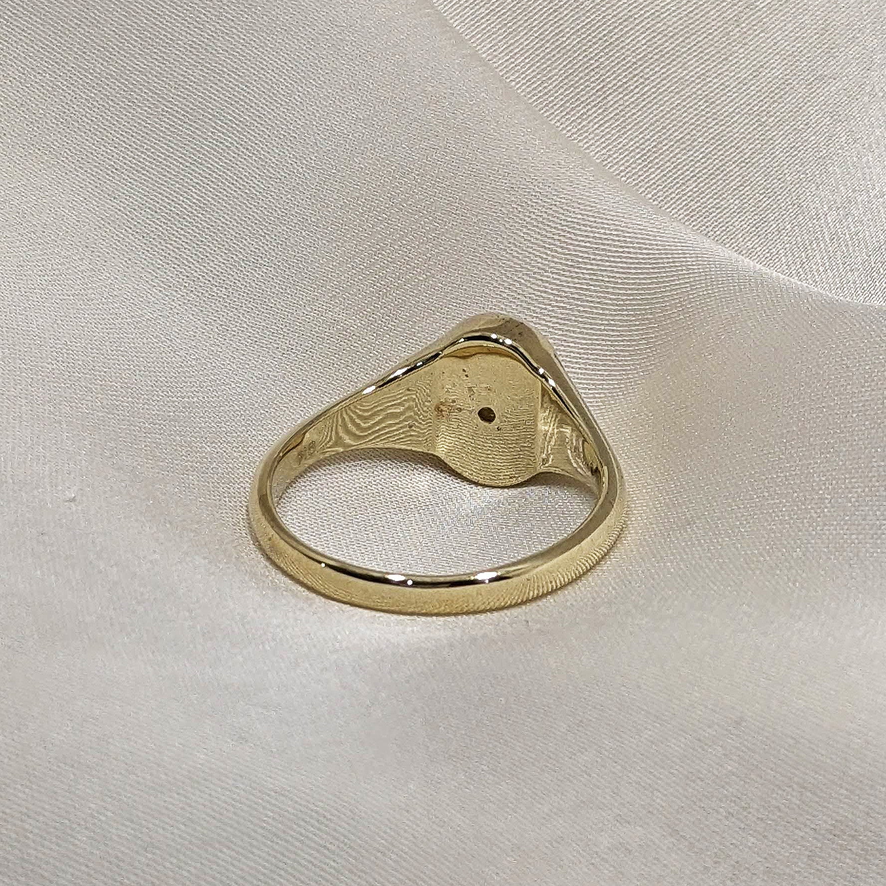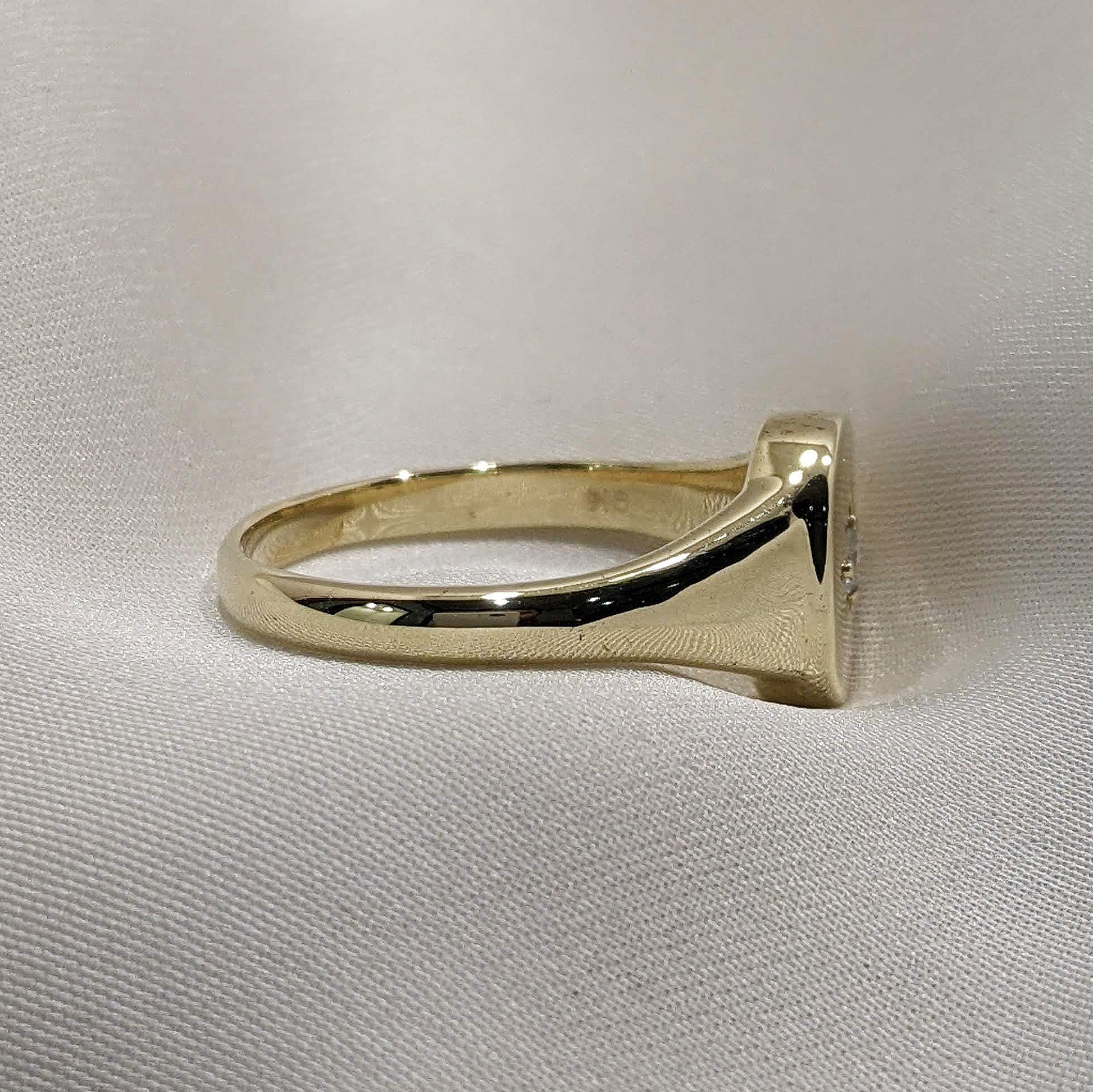 Elegant, refined and set with a 0.05ct Diamond for a statement. This 9ct Yellow Gold Signet ring keeps its traditional past, whilst adding a point of difference. The top surface of the Signet is just within 1cm of length, with the base being 3mm.