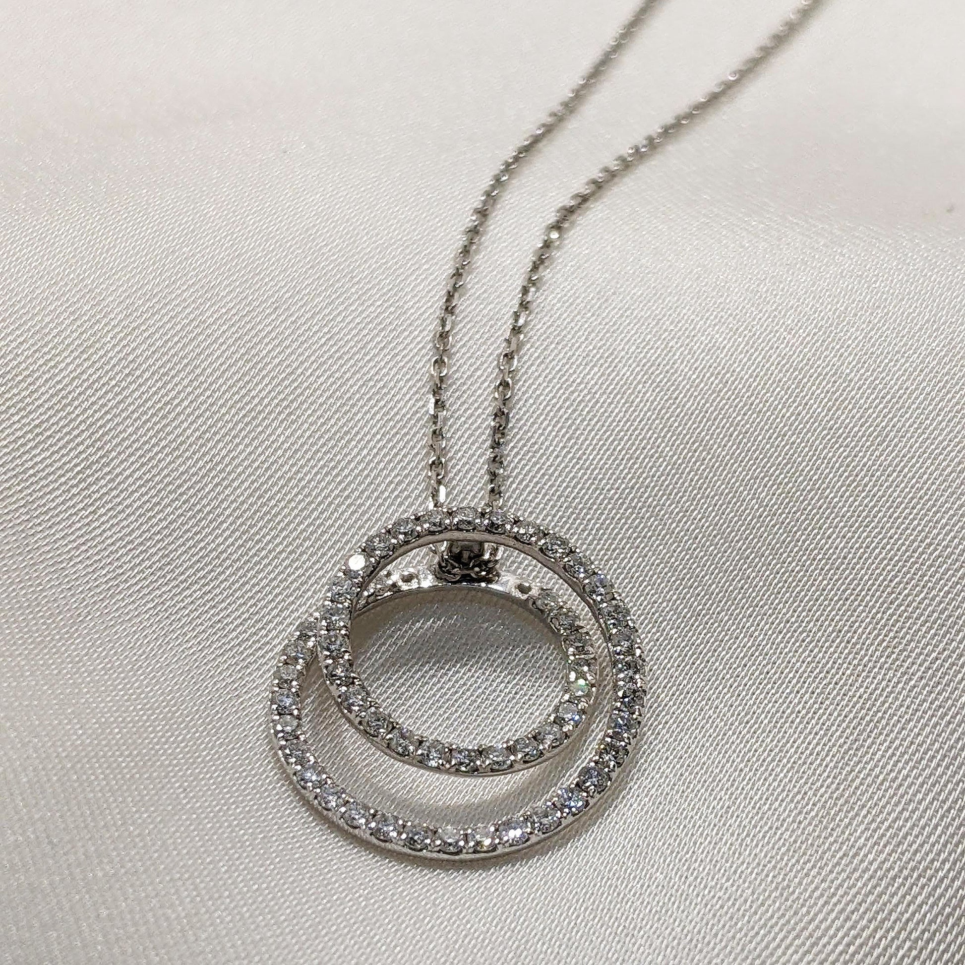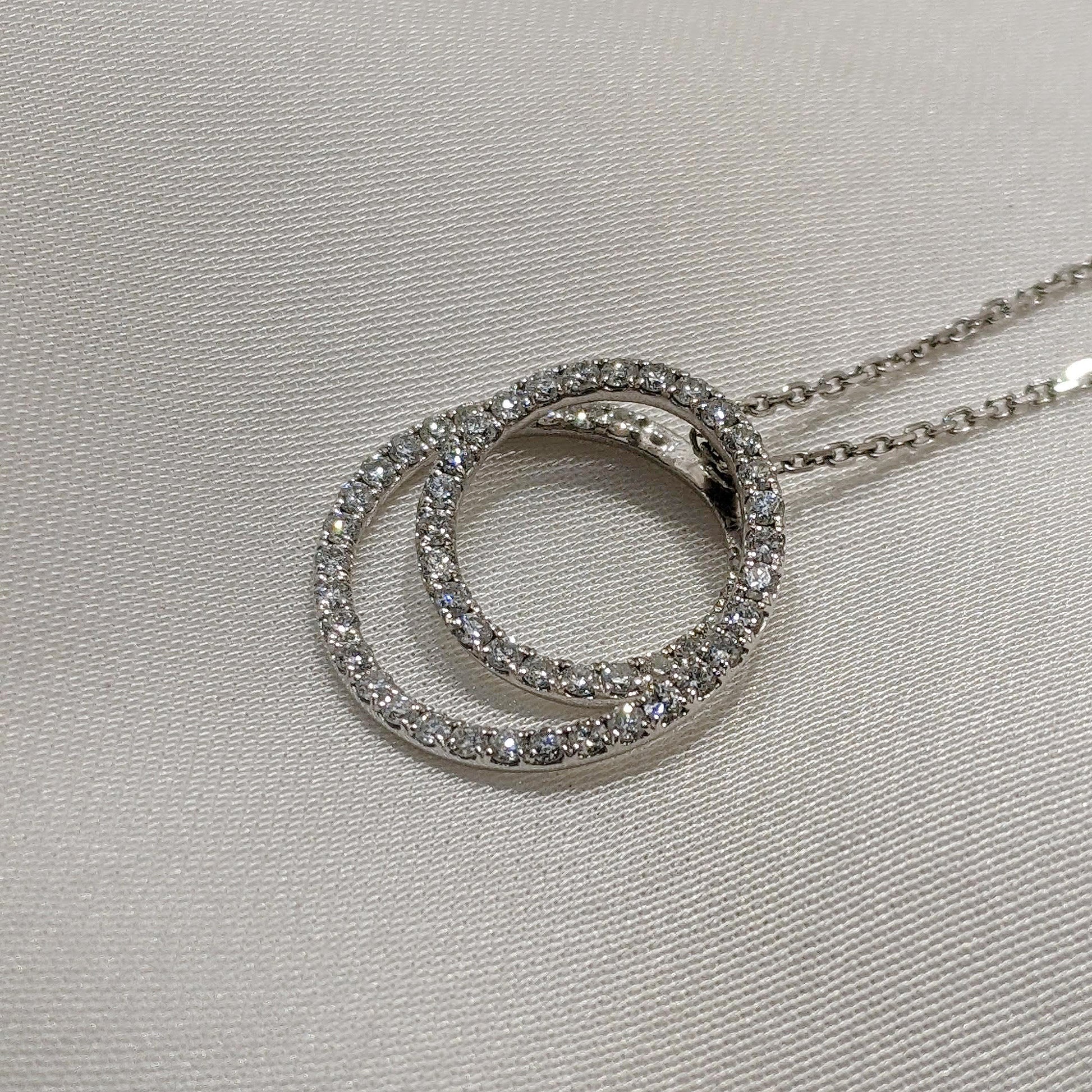 This elegant Double Circle of Life necklace is crafted from 9ct White Gold and set with 0.34ct of natural white Diamonds in a delicate micro-set design. It hangs from a 16-inch fine 9ct White Gold Belcher chain, making it perfect to wear alone or layered with other necklaces.