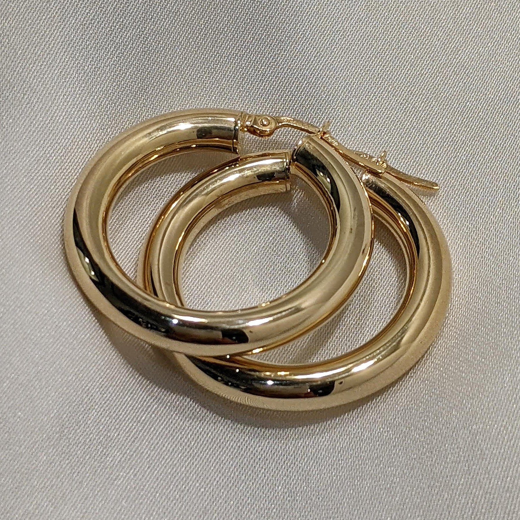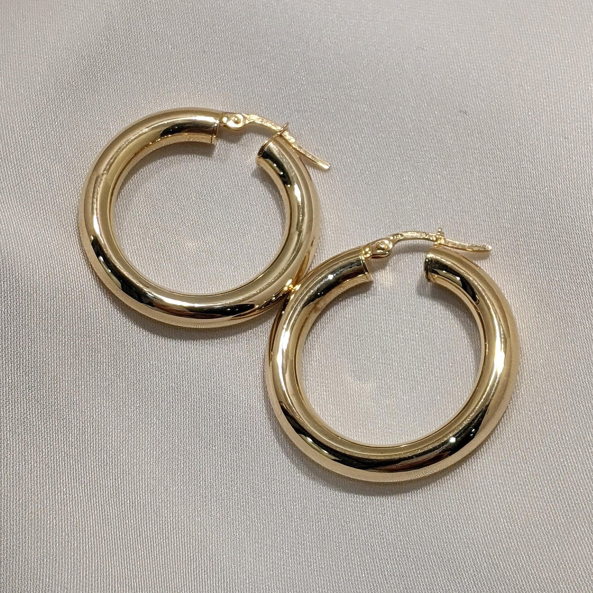 One of the most traditional and easy to dress hoops to be made. Our 9ct Yellow Gold are rounded, hinge-clasped and polish-finished.